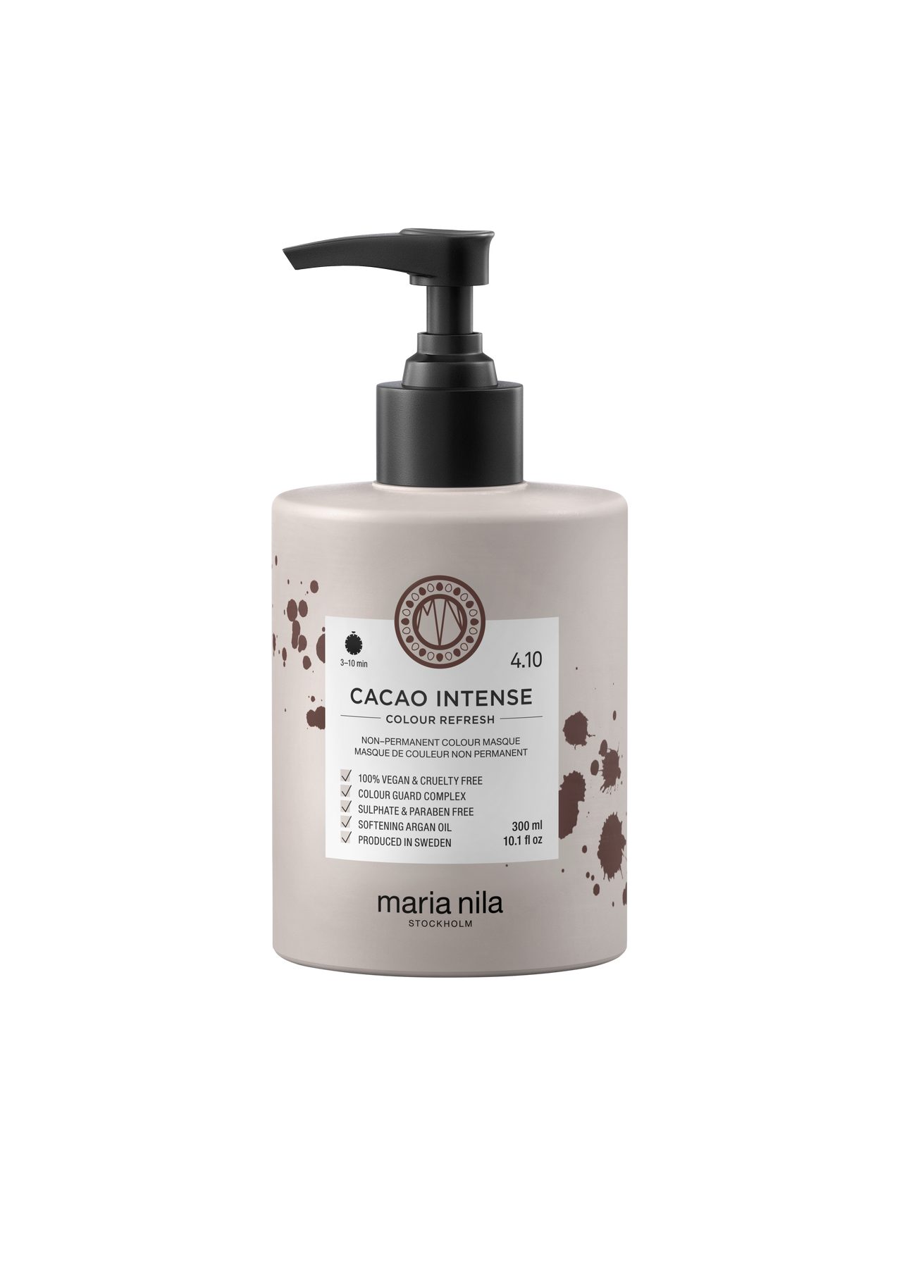 Maria Nila Colour Refresh Cacao Intense 300 ml: En vårdande inpackning som innehåller tillfälliga färgpigment som snabbt fräschar upp hårfärgen. En riktig färgbomb som även är mjukgörande och minskar frizz för ett silkeslent resultat. Varje Colour Refresh kommer alltid med två medföljande plasthandskar för applicering. Alla färger går att blanda med Colour Refresh White Mix för att skapa pastellfärger. Du kan även mixa olika färger för att skapa en unik nyans. Perfekt att använda mellan salongsbesök eller inför en speciell tillställning.